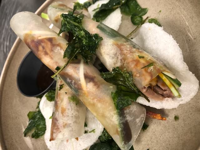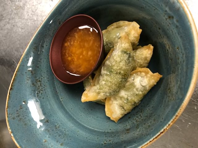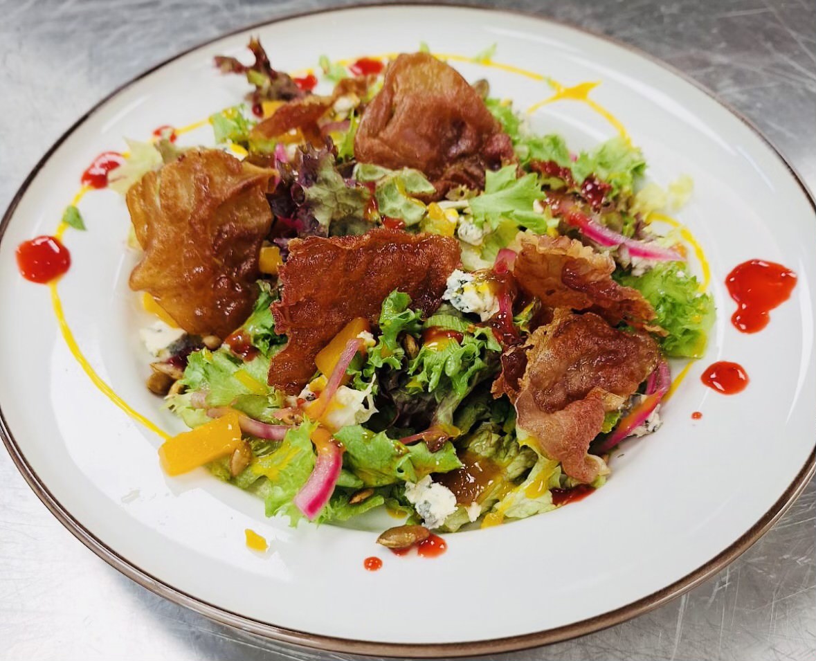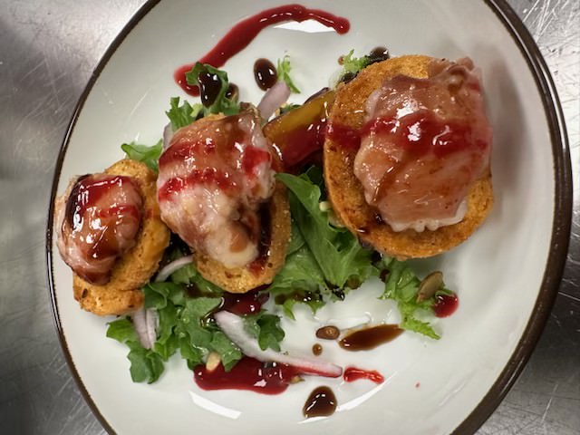 285,-med syltet gresskar, pinjekjerner, rødløk og topper den med parmasurret chevre og crostini. triodressing – coulis på bjørnebær, balsamico og honning. Allergener: hvete, melk, sulfitt