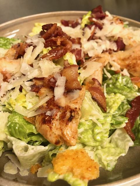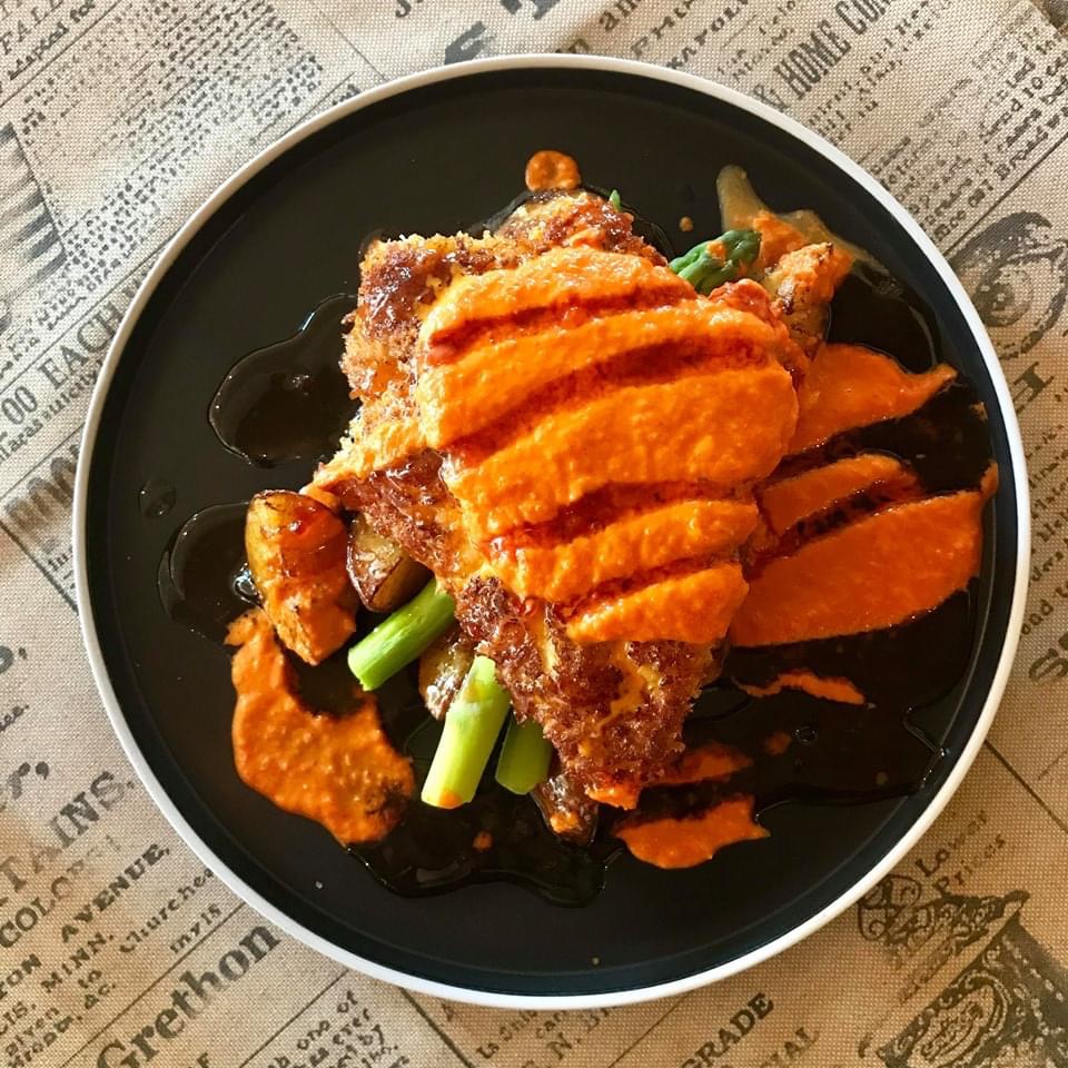 365,-Kokkens signaturrett. Marinert kyllingfilet panert med parmesanost og vår krydderblanding. med ristede poteter, asparges, brokkolini, chilikaramell og paprikasaus. Allergener: Hvetemel, Selleri, egg, melk. Be om glutenfri.