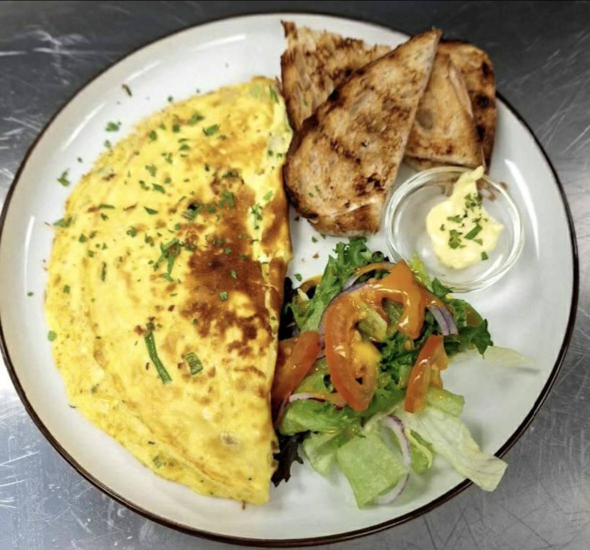185,-Med ost og skinke, salat- rødløk- tomat og sennep og honningsvinaigrette- brød og smør. Vegetar med soltørket tomat, rødløk og bakt paprika. Allergener: Hvete, melk, egg, sennep